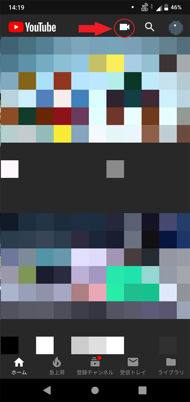 a.YouTubeアプリを開いて、矢印のカメラマークをタップします。