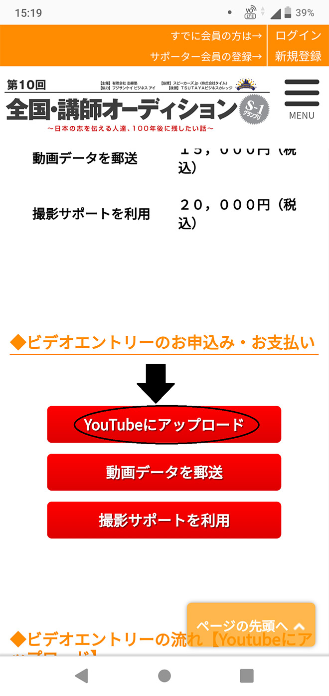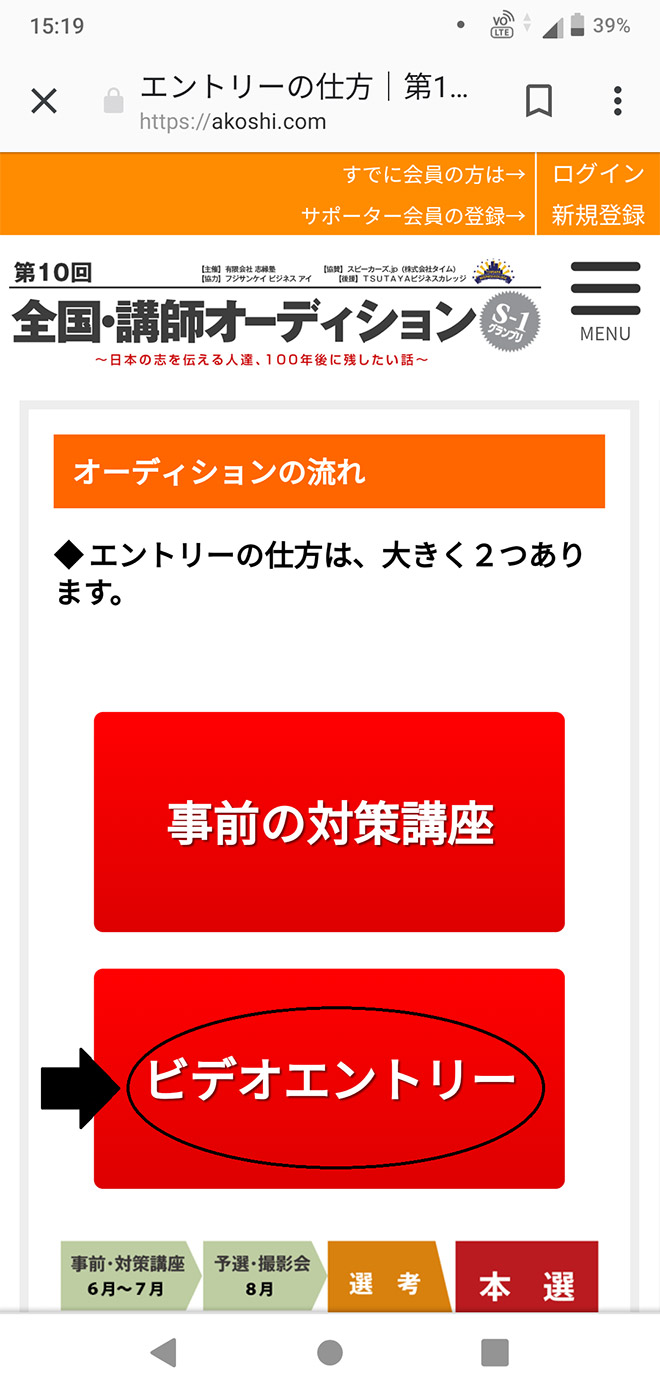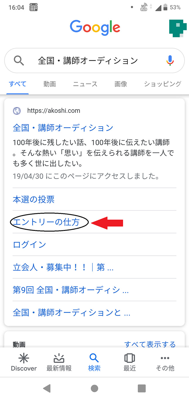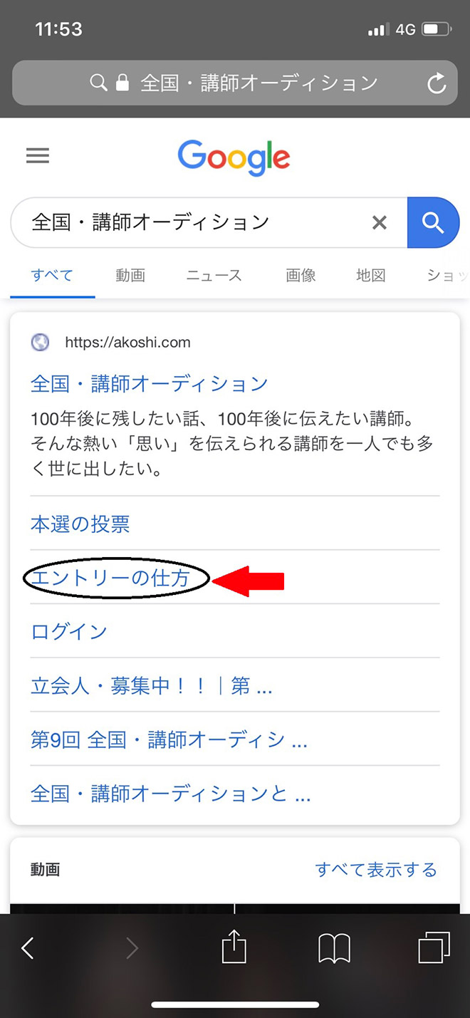 a.ブラウザで「全国・講師オーディション」と検索して、矢印の「エントリーの仕方」をタップします。